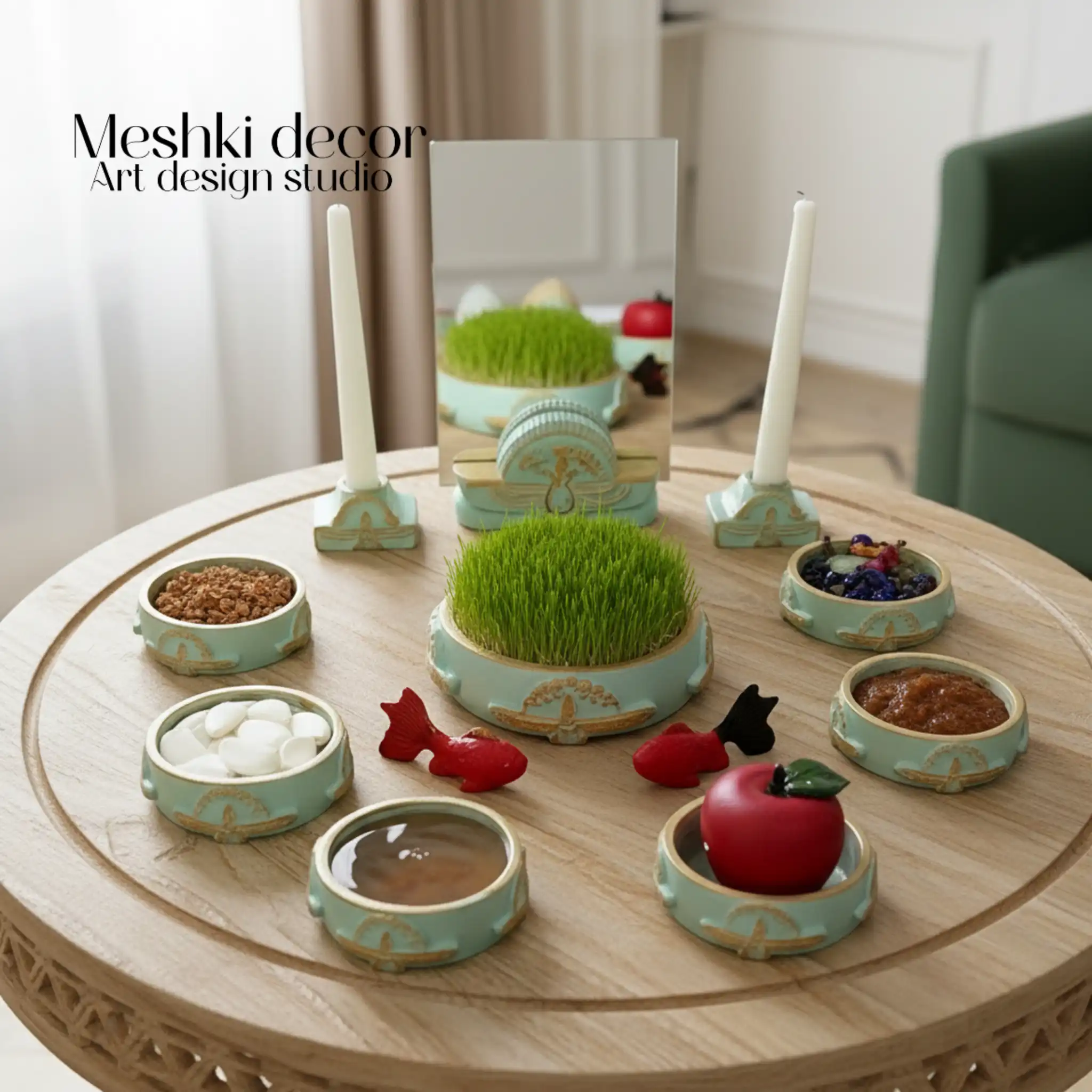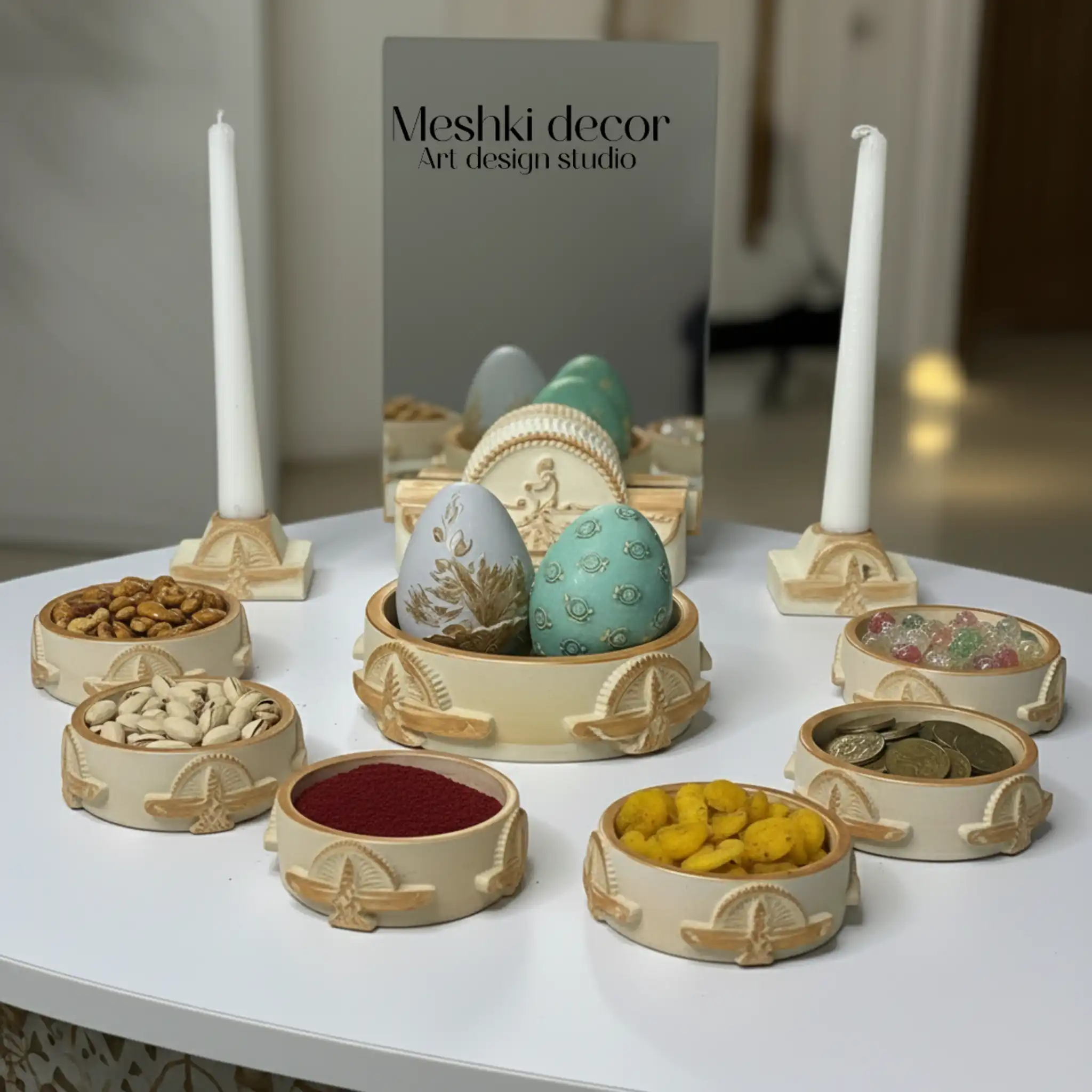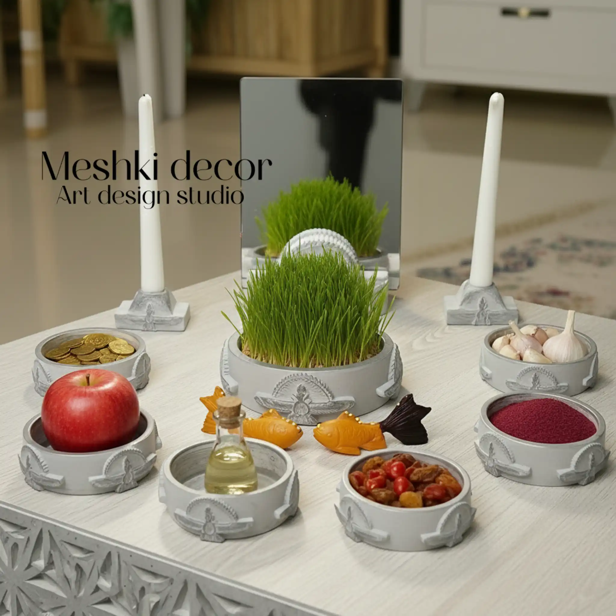 این مجموعه از جنس سنگ مصنوعی با ۱۰ پارچه (۶ ظرف قطر ۹ سانتیمتر برای سنجد، سرکه، سماق، سبزی، سنجد و سیر؛ ظرف سبزه قطر ۱۵ سانتیمتر؛ ۲ جا شمعی برای شمع؛ پایه آینه و آینه برای نمایش)، تمام عناصر هفتسین را در یکجا گردآوری میکند و کهنهکاری طلایی یا نقرهای، جلوهای لاکچری و سنتی به دکور میبخشد. رنگهای کرم کهنهکاری طلایی برای حس گرما و اصالت، سبز کهنهکاری طلایی برای طراوت بهاری و طوسی کهنهکاری نقرهای برای سادگی مدرن، آن را با دکوراسیونهای سنتی، مینیمال یا نوروزی سازگار میکند. این هفتسین سنگ مصنوعی با اصالت و جدید، برای خانههای کوچک و آپارتمانها ایدهآل است و بهعنوان هفتسین ارزان و جمعوجور، تجربهای معنوی و فرهنگی از عید را ارائه میدهد.