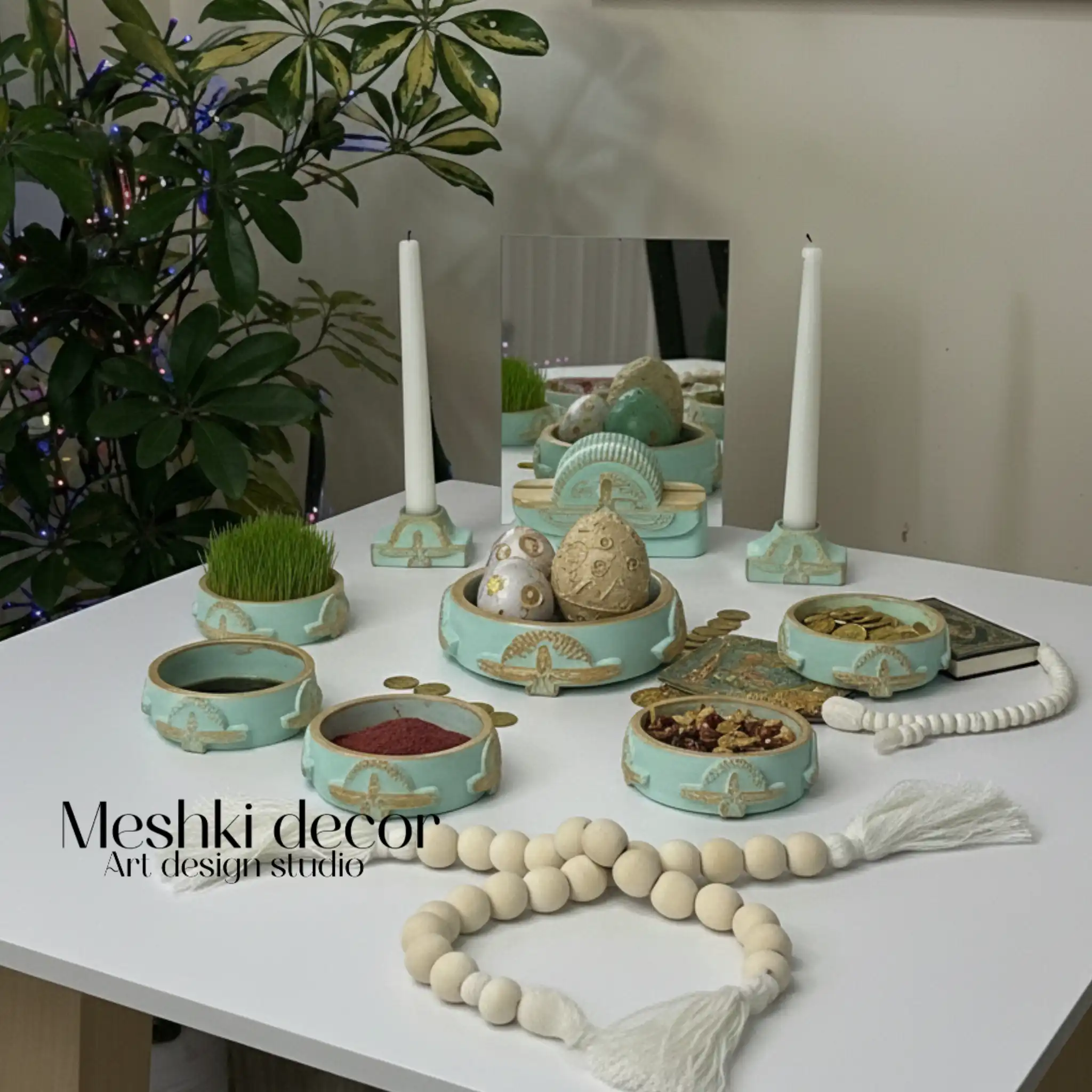 این هفتسین شامل ۶ ظرف قطر ۹ سانتیمتر، یک ظرف سبزه قطر ۱۵ سانتیمتر، ۲ عدد جا شمعی، پایه آینه و آینه (مجموع ۱۰ پارچه) است و در ۳ رنگ کرم کهنهکاری طلایی، سبز کهنهکاری طلایی و طوسی کهنهکاری نقرهای عرضه میشود. مناسب برای دکوراسیونهای سنتی، مینیمال یا نوروزی، این هفتسین ایرانی لاکچری گزینهای ایدهآل برای خانههای کوچک و هدیهای جذاب برای عید نوروز است.