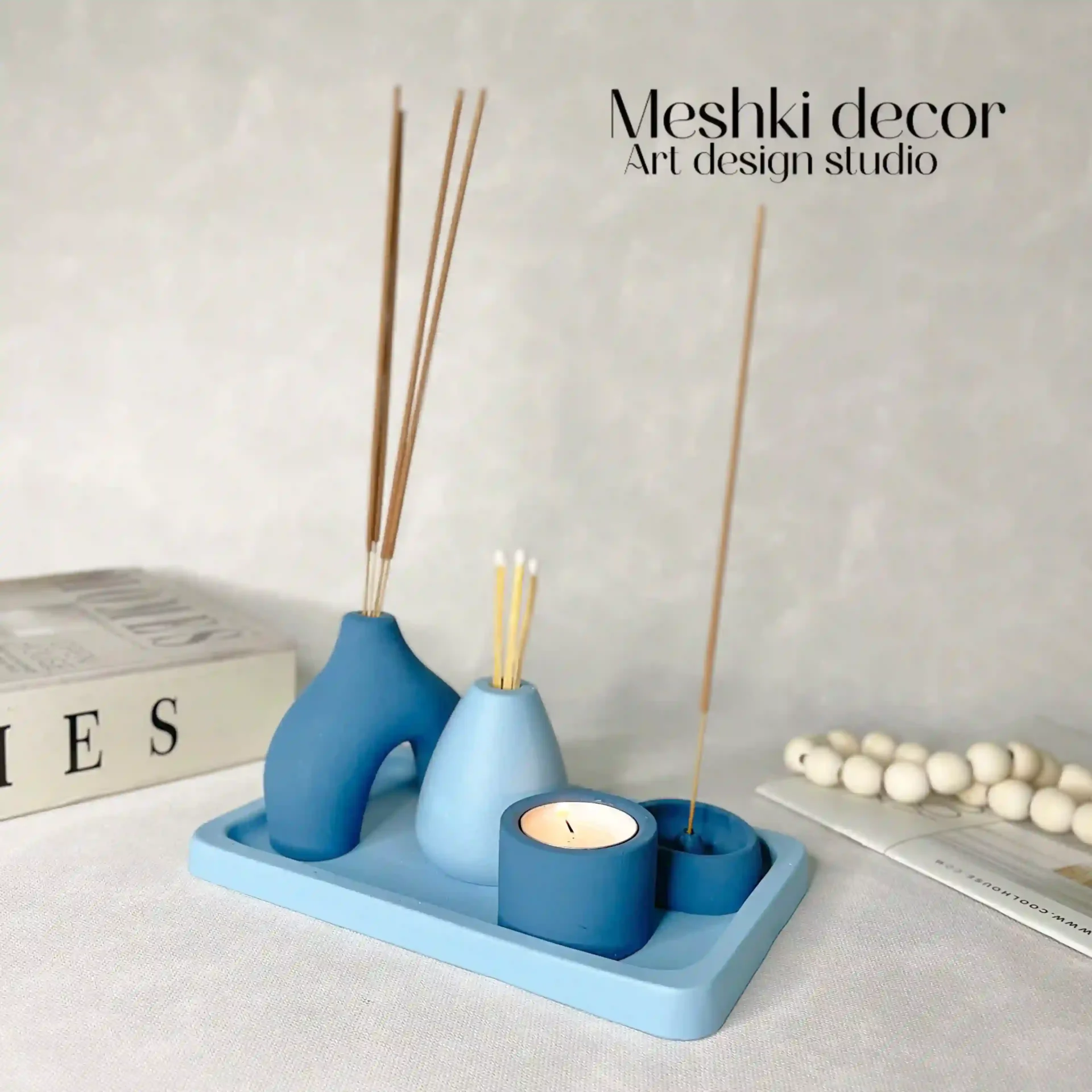 ست شامل جا عودی خمره‌ای، عود سوز دایره‌ای، جا شمع وارمری، گلدان پافیلی کوچک و سینی مستطیل در ابعاد 30 در 20 سانت است و امکان سفارشی‌سازی رنگ، آن را به گزینه‌ای انعطاف‌پذیر برای دکور یا هدیه تبدیل می‌کند.