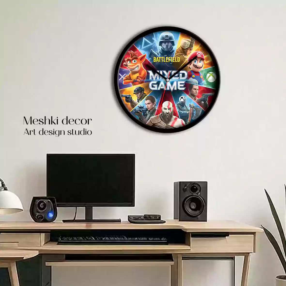 ساعت دیواری و رومیزی فانتزی طرح گیمینگ از برند مشکی دکور، انتخابی بینظیر و اقتصادی برای افزودن زیبایی و کاربردی بودن به دکوراسیون شماست. با موتور آرامگرد کوارتز و فریم مشکی جنس سنگ مصنوعی، همراه با امکان سفارشیسازی، این محصول هم تزئینی است و هم عملکردی. این ساعت با طراحی بدون شیشه و اندازههای متنوع، هدیهای فوقالعاده برای هر مناسبتی است.