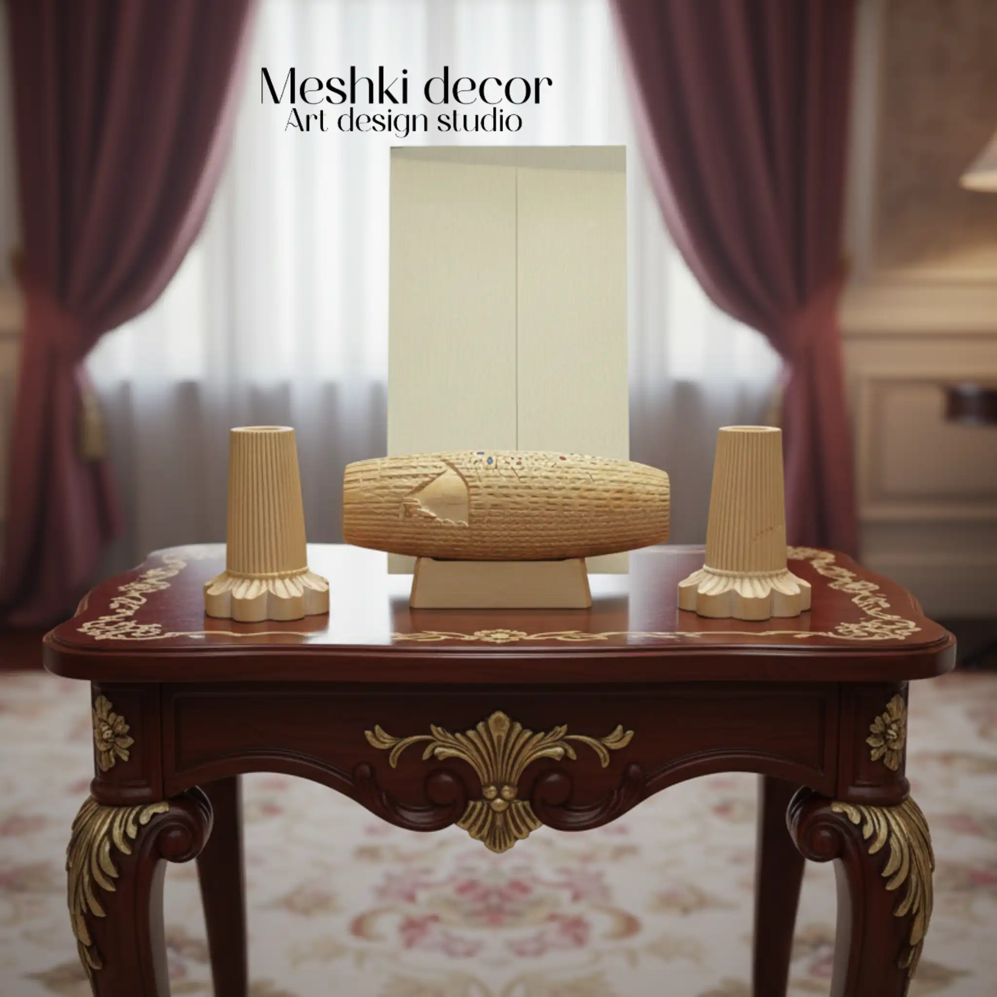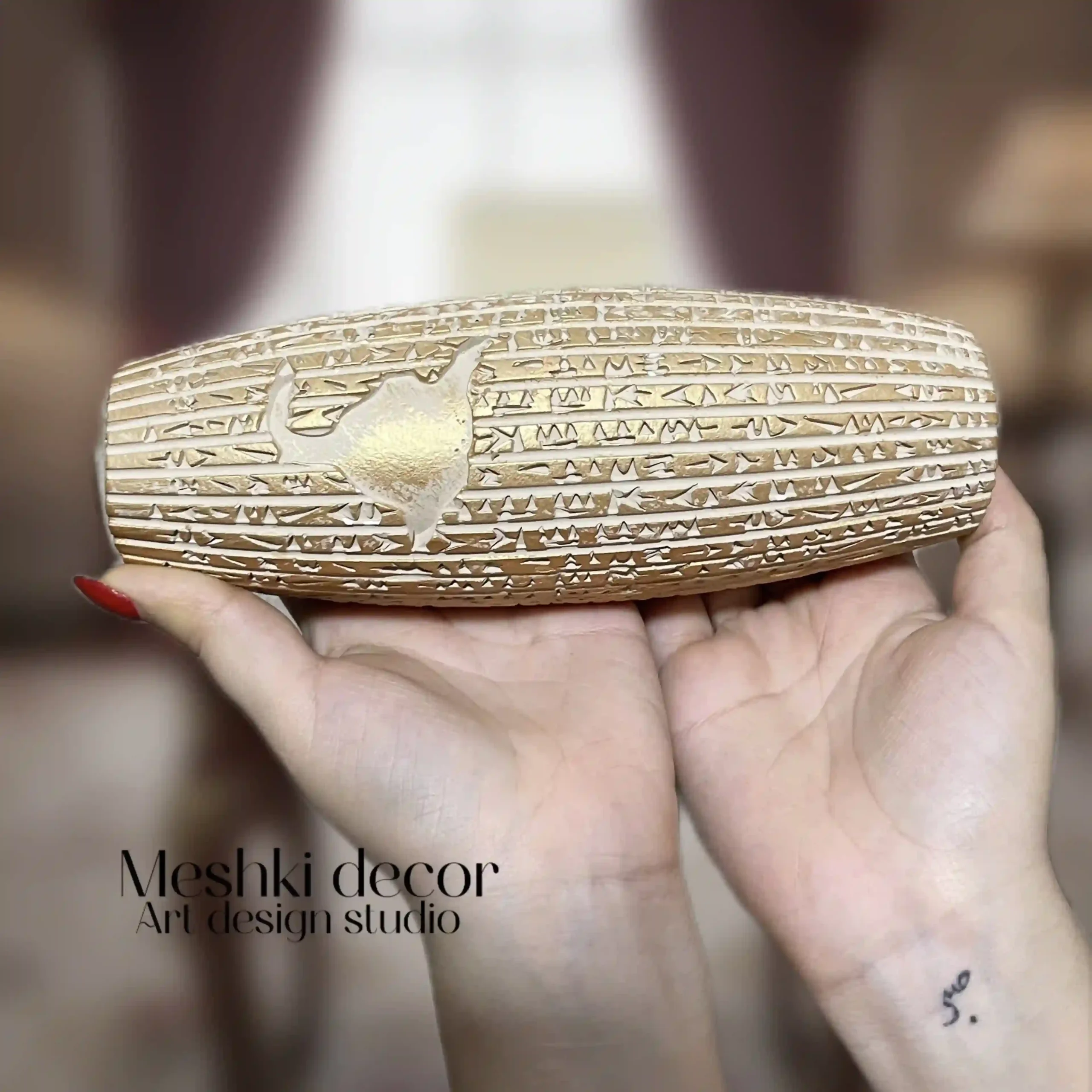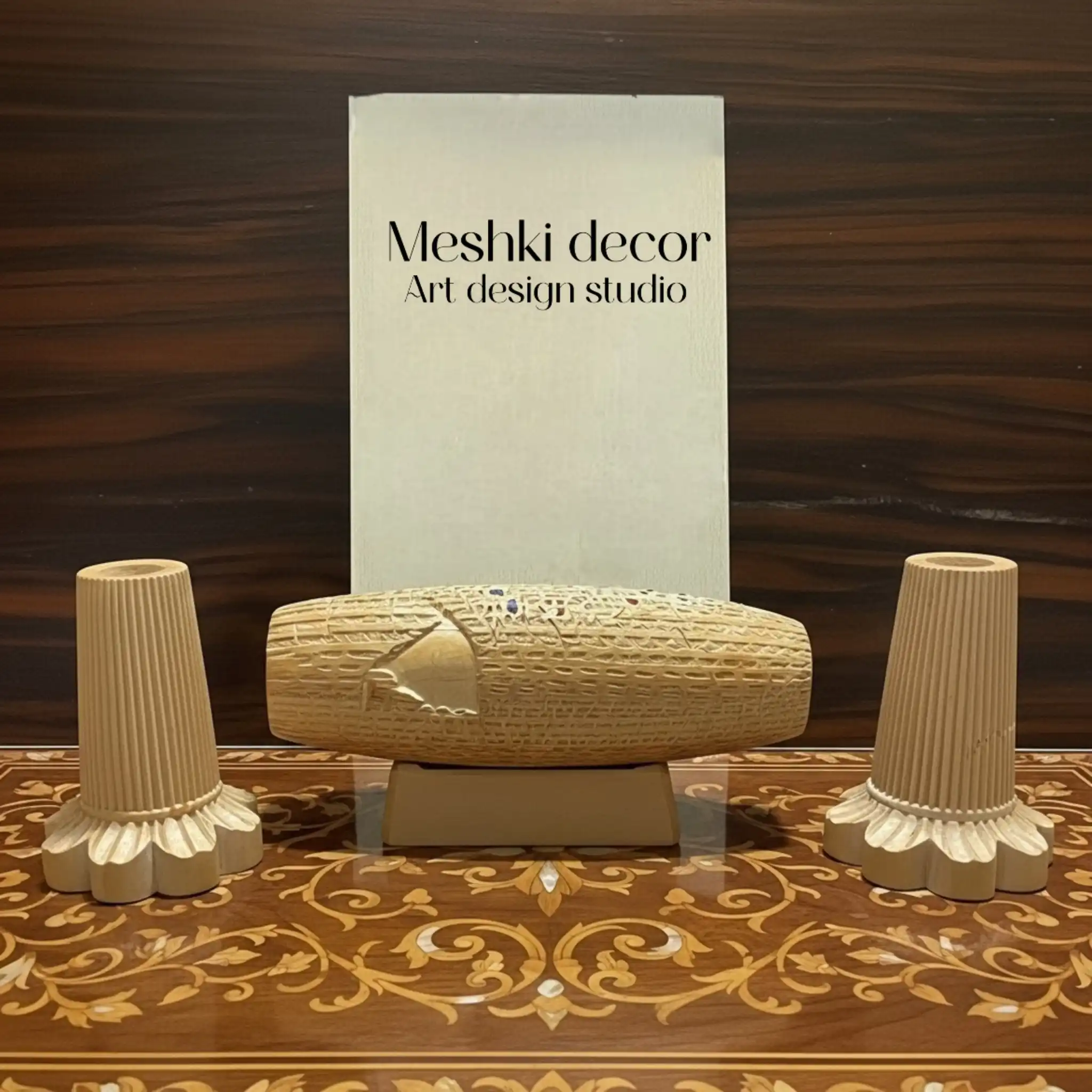 ست آینه و شمعدان کلاسیک مدل منشور کوروش با جنس سنگ مصنوعی، ترکیبی از هنر و اصالت است که شامل ۲ پایه شمعدان با طرح برجسته هخامنشی، پایه منشور و مجسمه منشور کوروش به‌عنوان نماد تاریخی، و آینه‌ای با ابعاد ۲۲ در ۱۵ سانتی‌متر است. کهنه‌کاری و پتینه‌کاری، بافتی قدیمی و شیک به این ست می‌بخشد و رنگ کرم با کهنه‌کاری طلایی حس گرما و کلاسیک، و رنگ طوسی با کهنه‌کاری نقره‌ای سادگی و مدرنیته را به دکور اضافه می‌کند. این ست دکوراتیو نه‌تنها برای چیدمان نوروزی، بلکه برای تزئین سالانه اتاق نشیمن، کنسول یا قفسه‌ها مناسب است و به‌عنوان هدیه‌ای باارزش، هویت پارسی را به نمایش می‌گذارد.