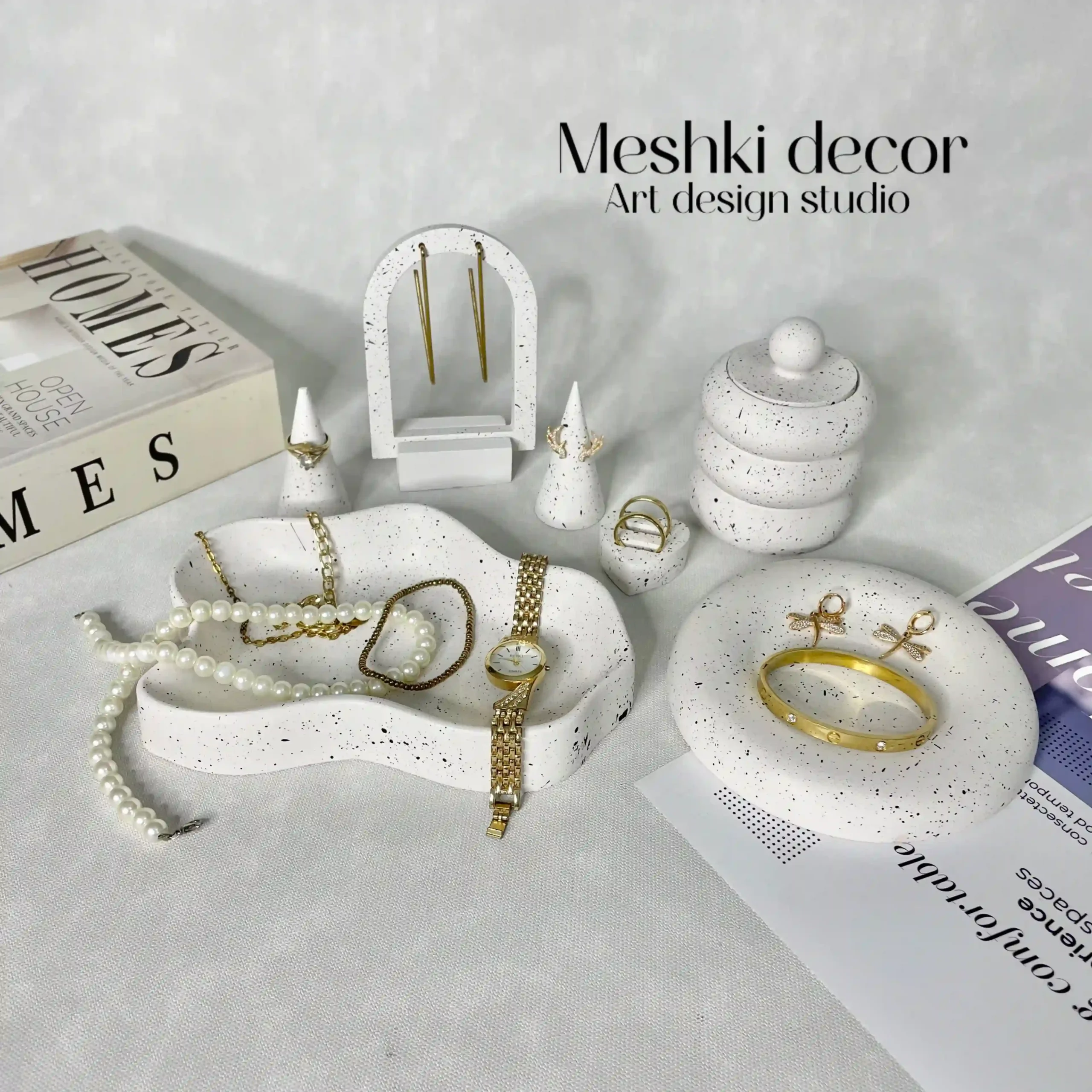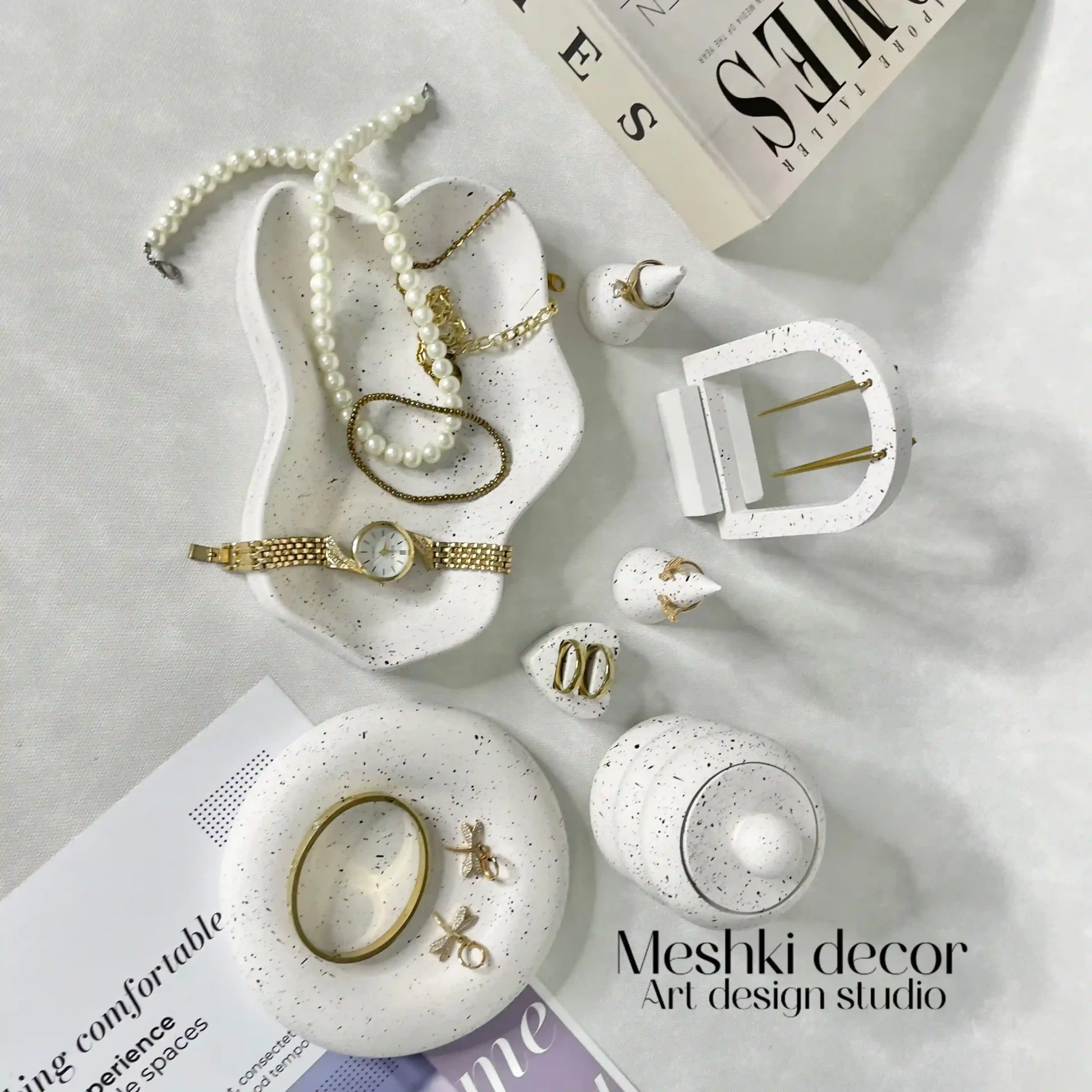 این ست با طراحی مینیمال و پترن خالدار سیاه از جنس سنگ مصنوعی، با سبکهای متنوعی سازگار است. در دکوراسیون مدرن، ترکیب سفید و خالدار با میزهای ساده، ظاهری شیک میسازد؛ در سبک بوهو، جا انگشتری هرمی با تزئینات طبیعی حس گرمی میدهد. سینیها و بانکه با سازماندهی، تعادل را به فضا میآورند و این ست برای دکوراسیون منزل، دکوراسیون داخلی، دکوراسیون اتاق خواب یا هدیه گزینهای ایدهآل است.