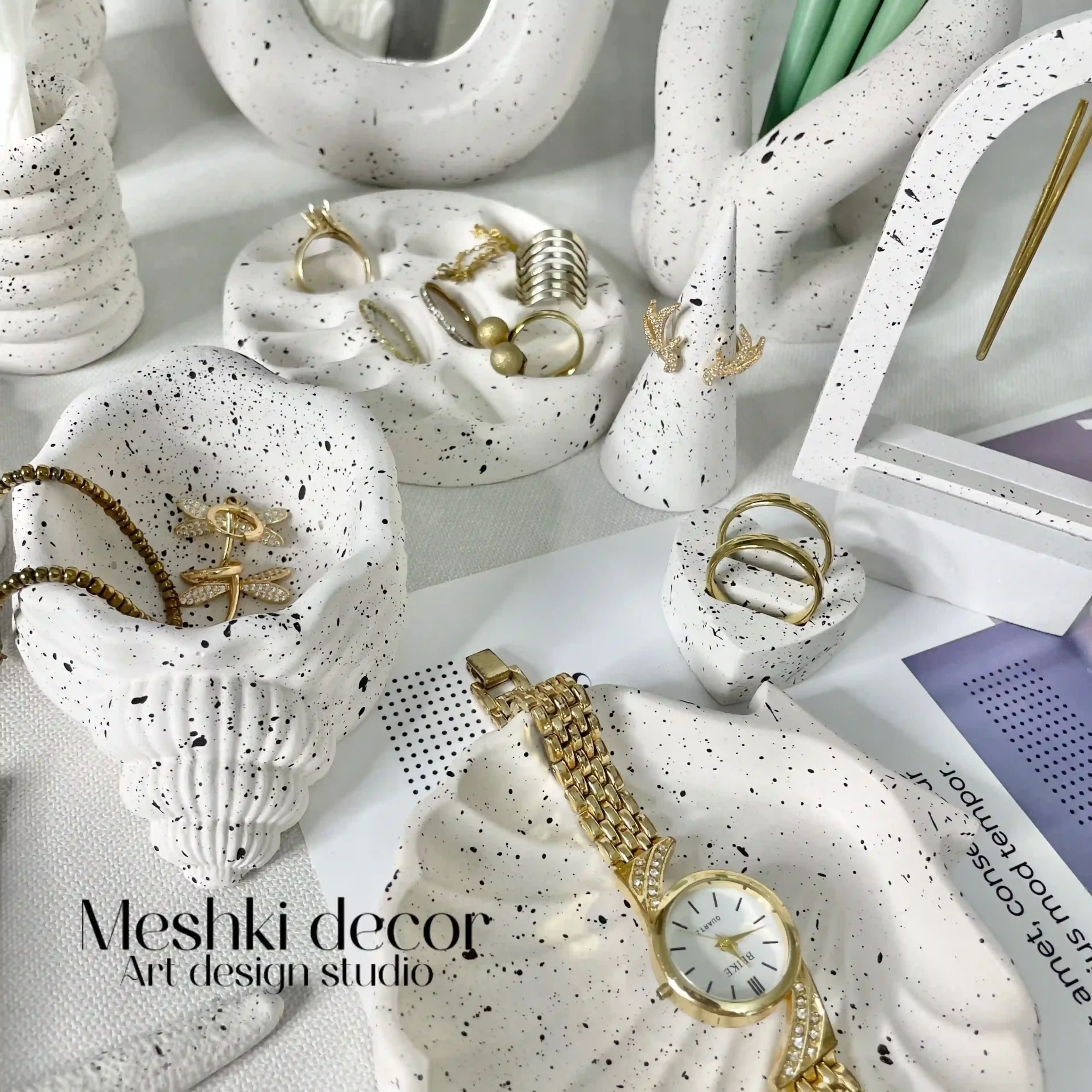 برای دکوراسیون پینترستی، جا حلقهای مدل قلبی را با حلقههای رنگی پر کنید و جا جواهری مدل صدف را در کنار شیپ ستاره دریایی قرار دهید. در فضای شخصی، از پترن خالدار برای ایجاد کنتراست با دکور سفید استفاده کنید. این چیدمانها دکوراسیونتان را خاص و دلپذیر میکنند.