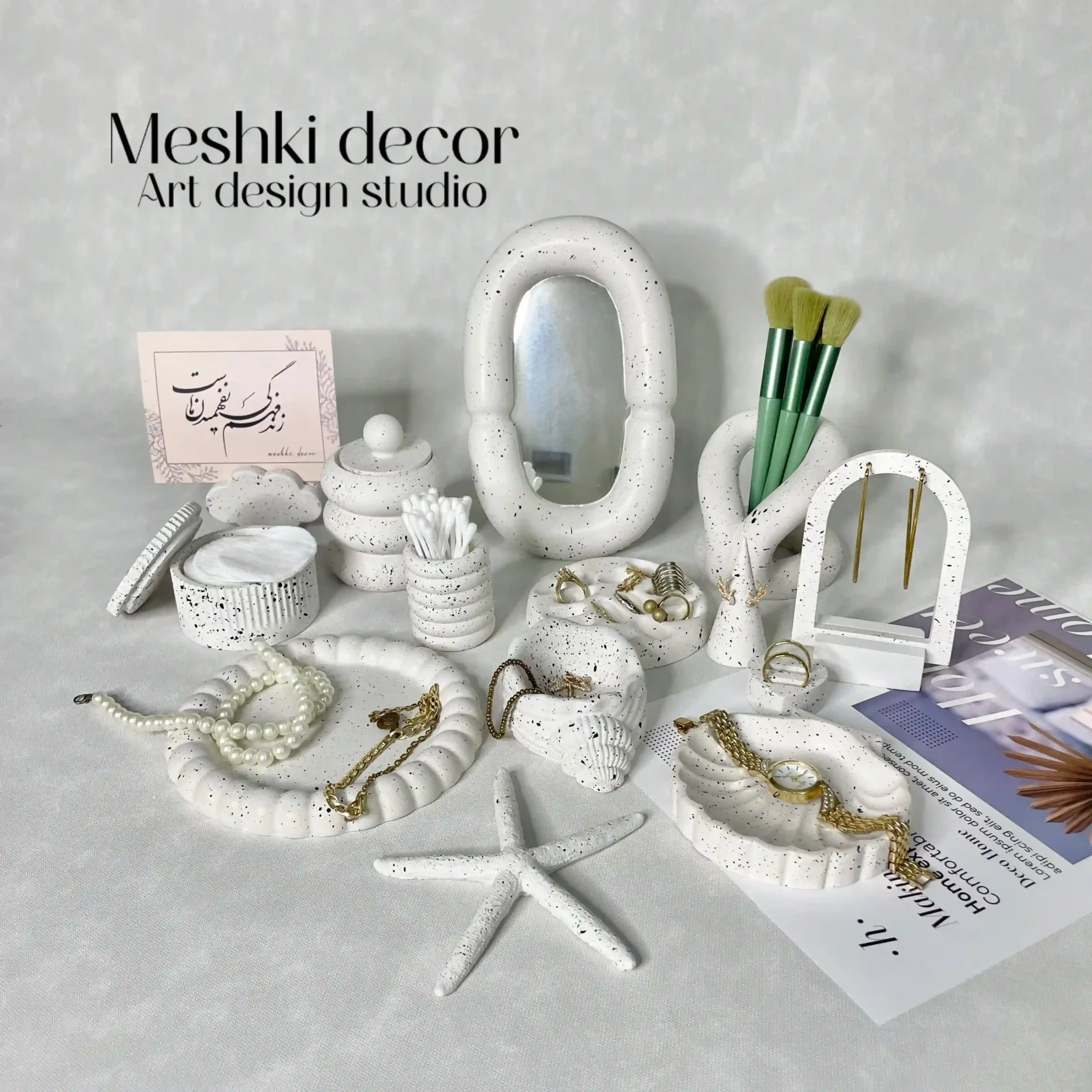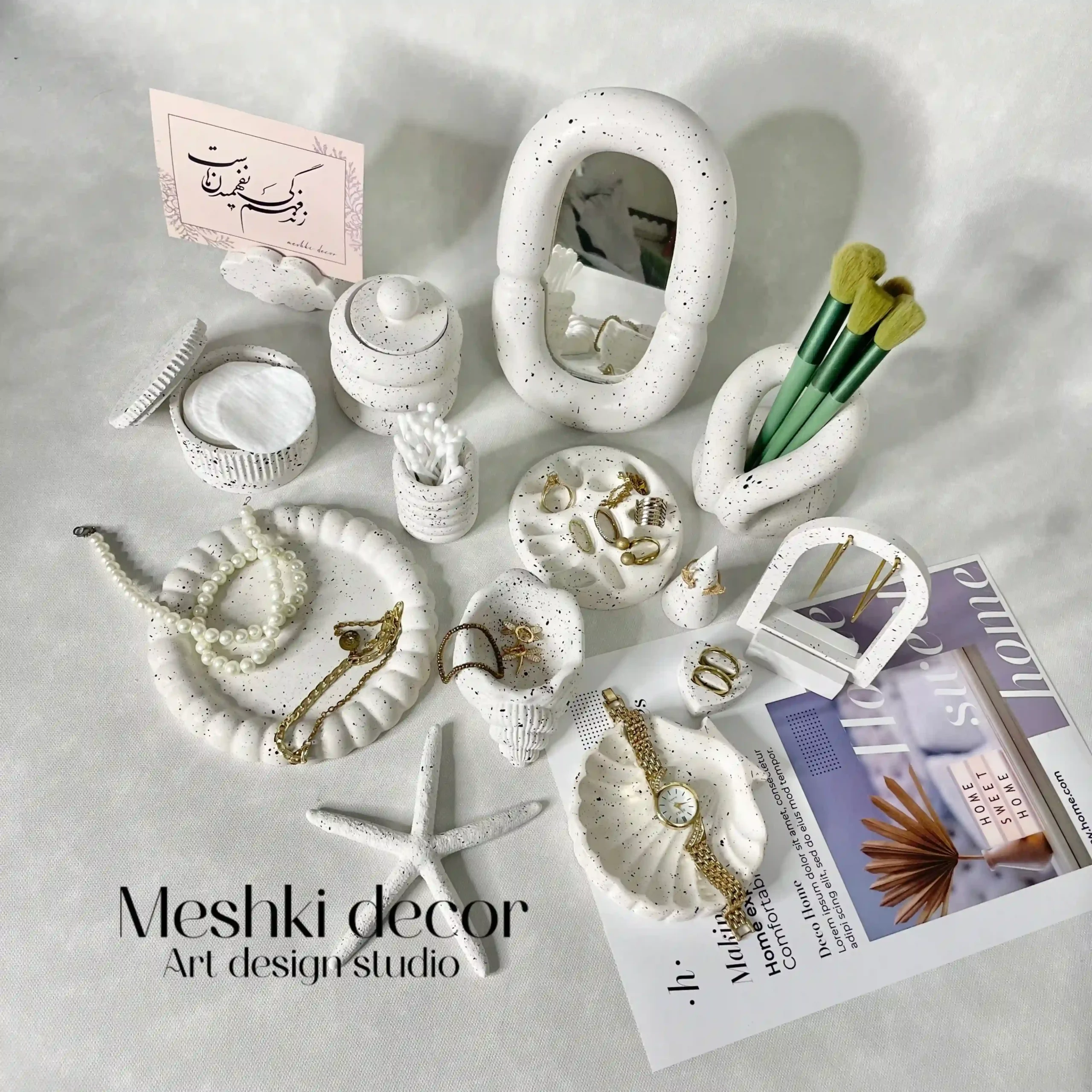 ست رومیزی جا جواهری و جا لوازم آرایشی پینترستی مدل ناز از برند مشکی دکور، انتخابی بینظیر و اقتصادی برای سازماندهی و زیبایی دکوراسیون شماست. با قطعاتی مثل ست آینه و جا براشی مدل پینترستی، بانکه دربدار، بانکه دربدار شیار دار، جا گوشپاککنی، سینی جا جواهری مدل مروارید، جا جواهری حلزون، جا جواهری مدل صدف، شیپ ستاره دریایی، جا حلقهای مدل قلبی، جا انگشتری مدل هرم و جا گوشوارهای مدل گنبدی، همراه با امکان سفارشیسازی، این مجموعه هم کاربردی است و هم تزئینی.