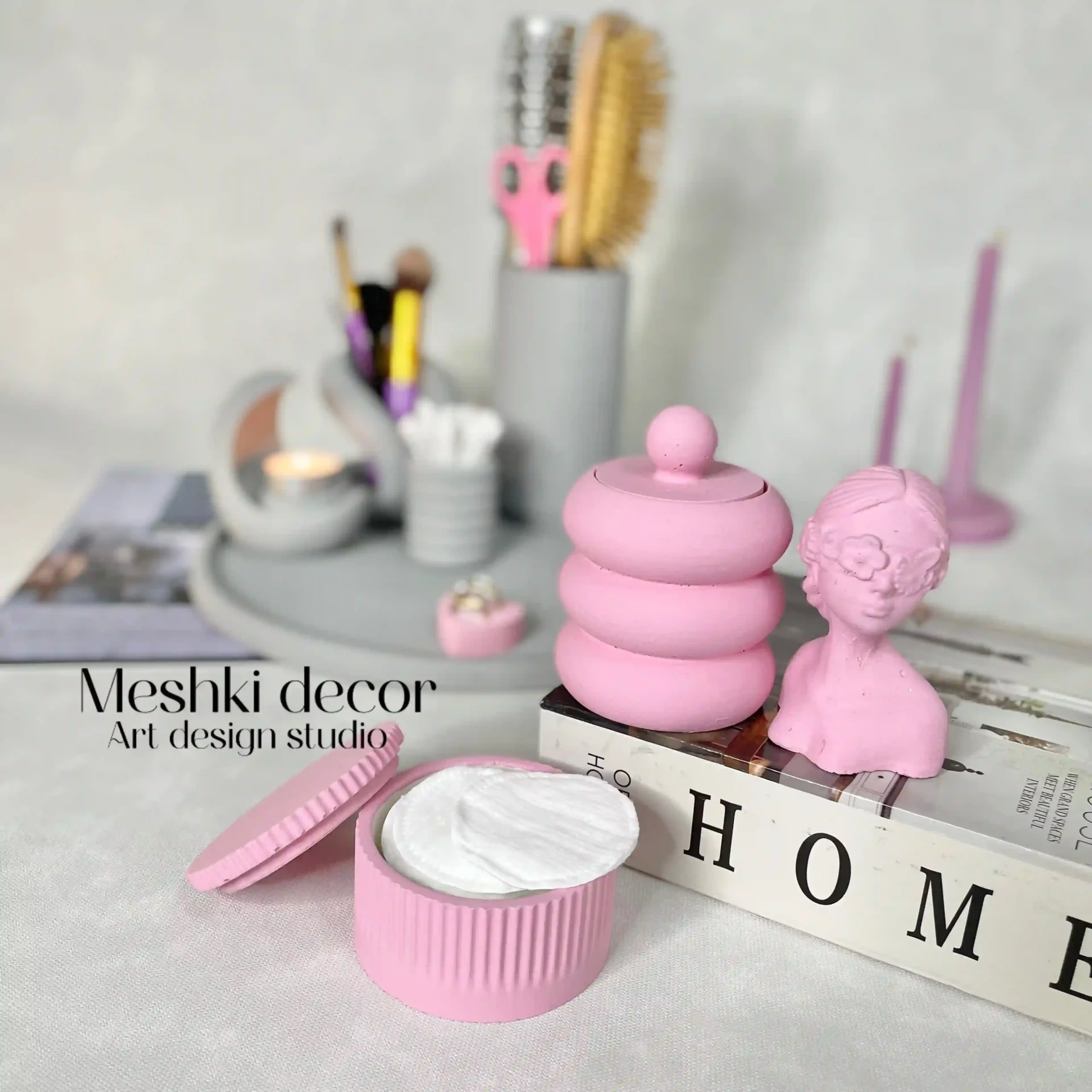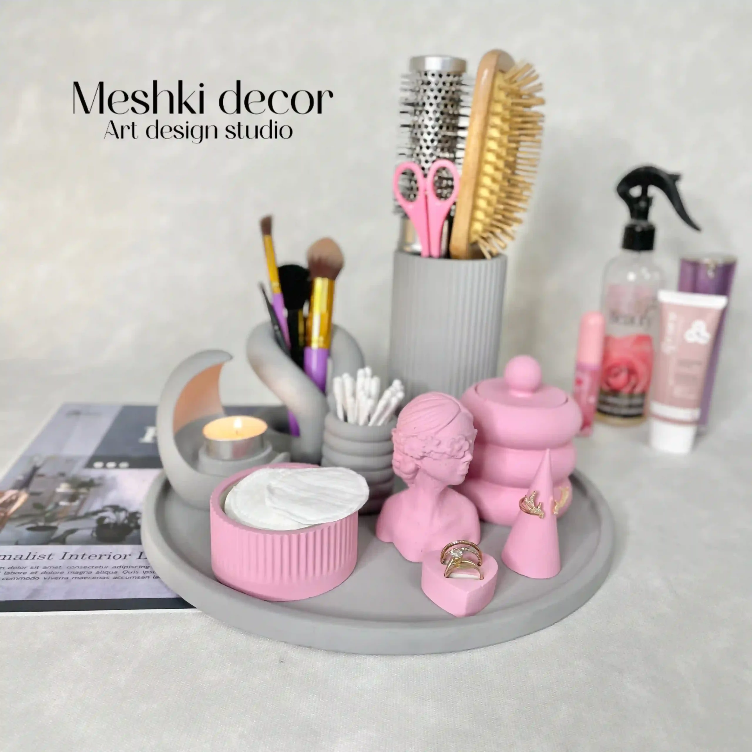 ست رومیزی نظمدهنده لوازم آرایشی طوسی صورتی مدل لوندیس با ترکیب رنگهای طوسی و صورتی، گزینهای مقرونبهصرفه و چشمنواز برای سازماندهی لوازم آرایشی، جواهرات و تزئینات روی میز آرایش، کنسول یا قفسههاست. این مجموعه از جنس سنگ مصنوعی با طراحی مینیمال، حس سادگی و مدرنیته را به دکوراسیون منزل شما میافزاید.