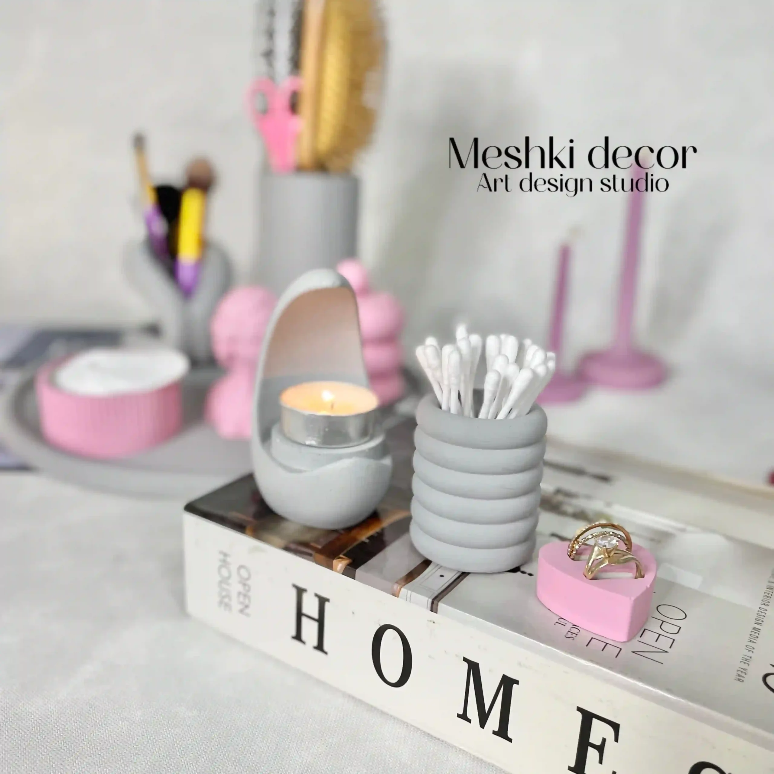 ست رومیزی نظمدهنده لوازم آرایشی طوسی صورتی مدل لوندیس از برند مشکی دکور، مجموعهای شیک و کاربردی با طراحی مینیمال است که از جنس سنگ مصنوعی ساخته شده و با ترکیب رنگهای طوسی و صورتی، جلوهای مدرن و رمانتیک به دکوراسیون شما میبخشد. این ست شامل جا برسی استوانهای شیار دار، جا براشی پینترستی، بانکه دربدار، جا گوشپاککنی، جا شمعی وارمری مدل ماه، بانکه شیار دار، مجسمه ناتلی، جا انگشتری هرمی، جا حلقهای قلبی و سینی دایرهای با قطر 30 سانتیمتر است. مناسب برای دکوراسیونهای مینیمال، مدرن یا اتاق خواب، این ست اقتصادی گزینهای ایدهآل برای سازماندهی لوازم آرایشی و هدیهای جذاب برای مناسبتهای خاص است.