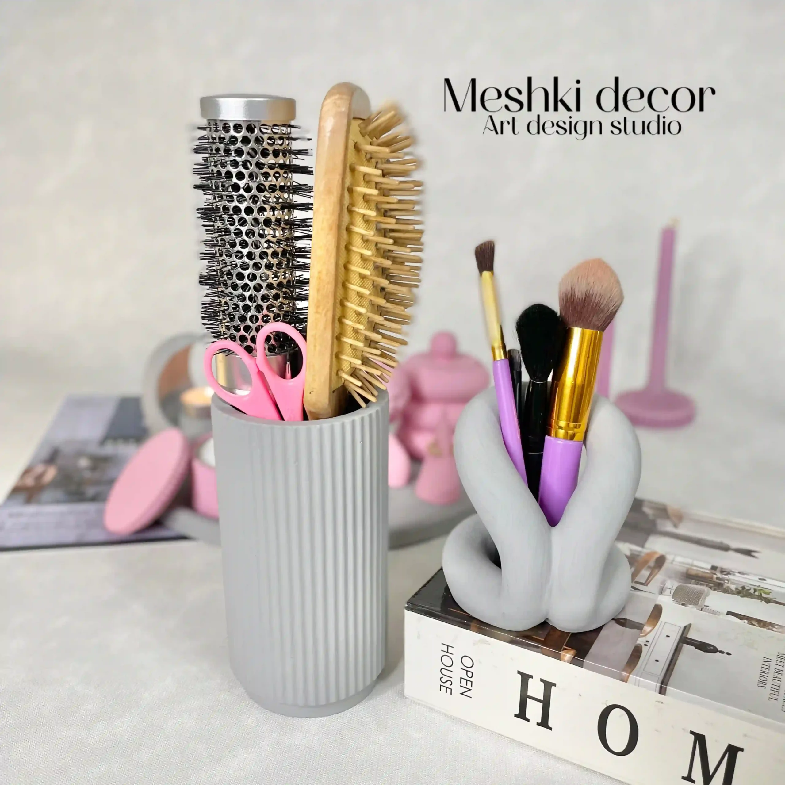 جا براشی پینترستی با طراحی خاص و رنگهای طوسی و صورتی از جنس سنگ مصنوعی، برای براش، مسواک و لوازم کوچک مناسب است. این قطعه از ست رومیزی نظمدهنده لوازم آرایشی طوسی صورتی مدل لوندیس، جلوهای هنری به میز آرایش میبخشد.