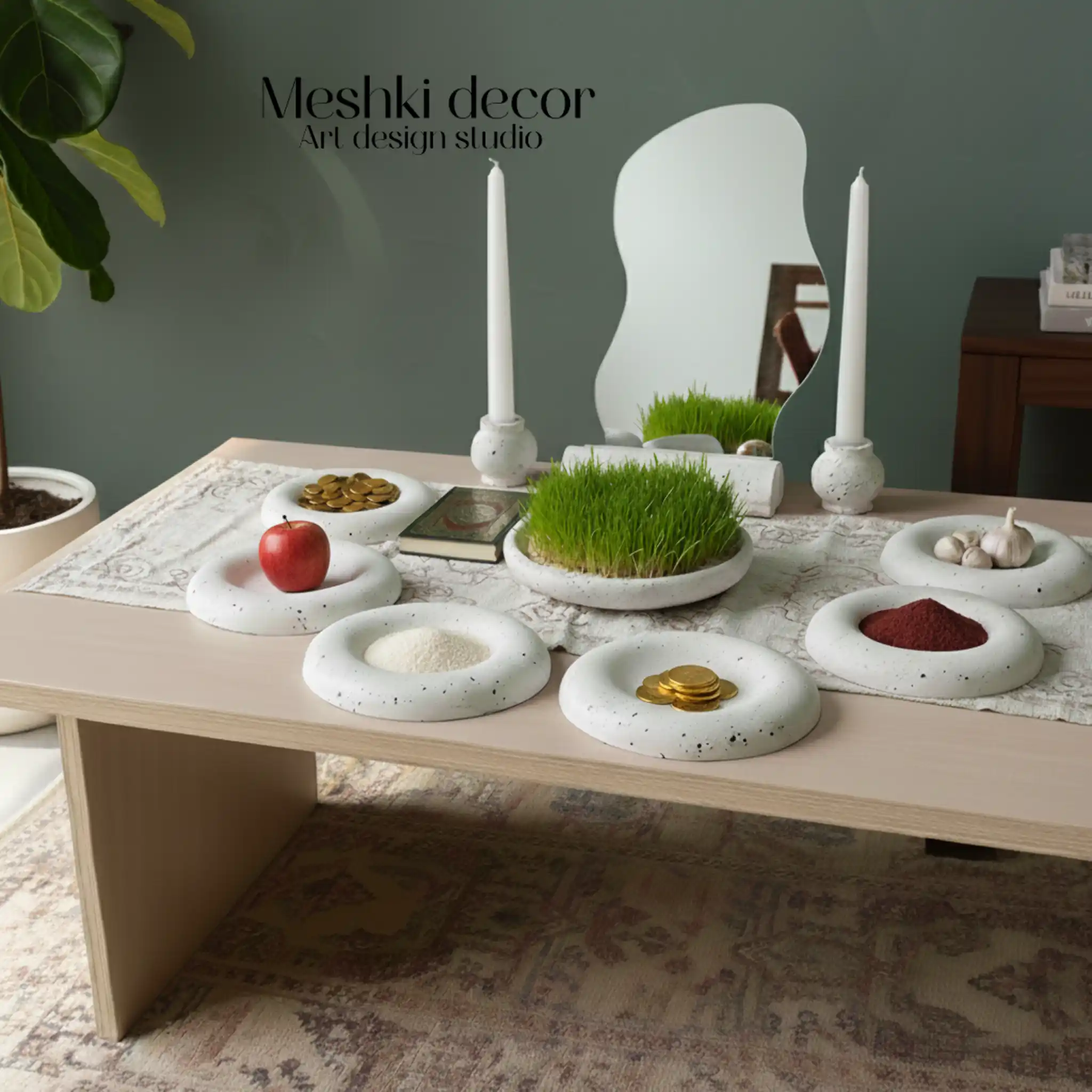 طراحی دفرمه آینه و ظروف، حس خلاقیت و تازگی را به سنت نوروزی میافزاید و هفتسین دکوراتیو با سادگی خود، بهراحتی روی میز ناهارخوری، کنسول یا قفسه جای میگیرد. این هفتسین سفید برای خانههای کوچک یا آپارتمانها مناسب است و هفتسین جدید با طراحی پینترستی، بهعنوان هدیهای شیک و ماندگار برای نوروز درخشش دارد.