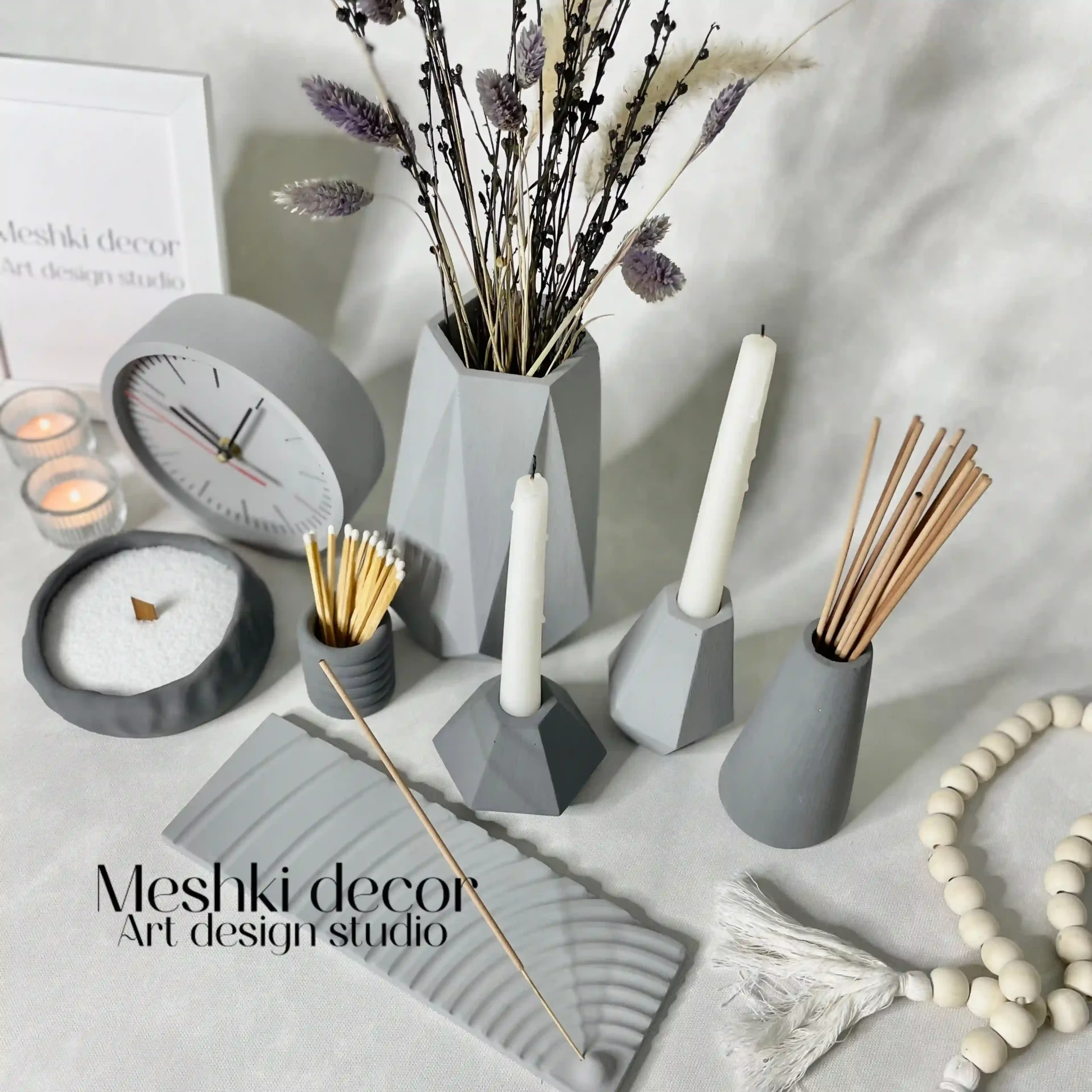 این ست شامل گلدان استوانه چندضلعی مدل الماس، ست جا شمعی چندضلعی کوچک و بزرگ، جا عودی دوکی، عود سوز شیار دار تخت، جا کبریتی مدل حلقه، ساعت رومیزی قطر ۱۵ سانت و شات شمع دفرمه (به همراه شمع پودری و فیتیله چوبی) است. این مجموعه با ترکیب تزئینات، نورپردازی و رایحهدرمانی، فضایی آرامشبخش و جذاب برای منزل شما ایجاد میکند و گزینهای ایدهآل برای دکوراسیون مینیمال طوسی است.