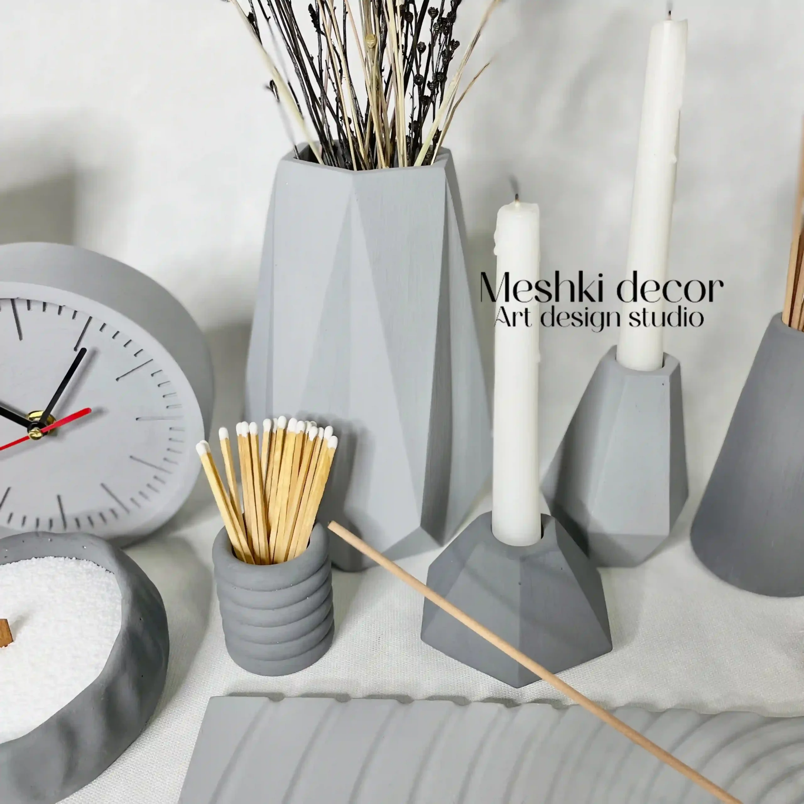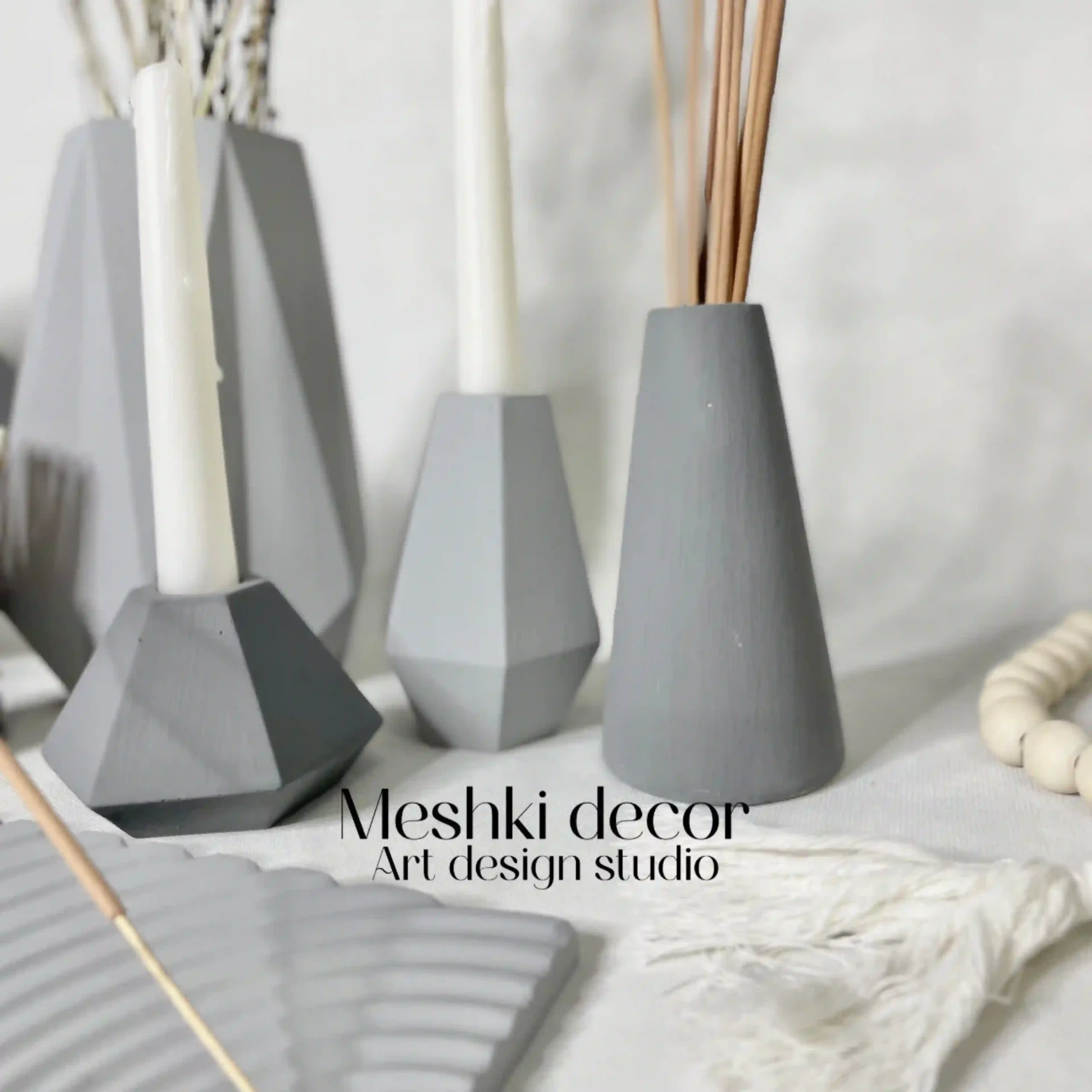 ست جا شمعی چندضلعی کوچک و بزرگ با رنگ طوسی روشن و تیره با طراحی هندسی از جنس سنگ مصنوعی، نور گرم و ملایمی ایجاد میکند و برای دکوراسیونهای مینیمال مناسب است. این بخش از دکوری رومیزی مینیمال طوسی تیره روشن مدل رادمان، اتمسفری صمیمی و دعوتکننده میسازد و برای شبهای آرام ایدهآل است.