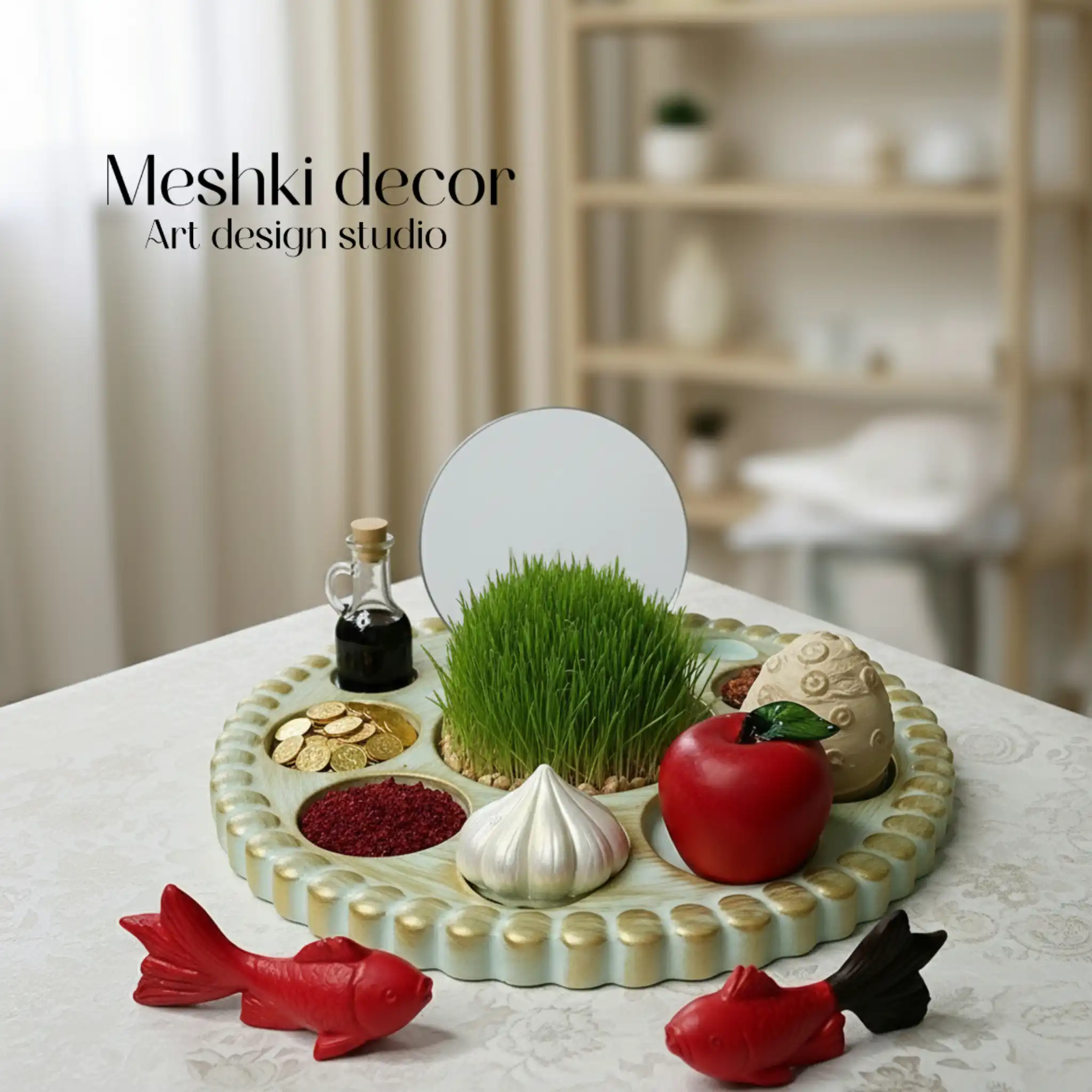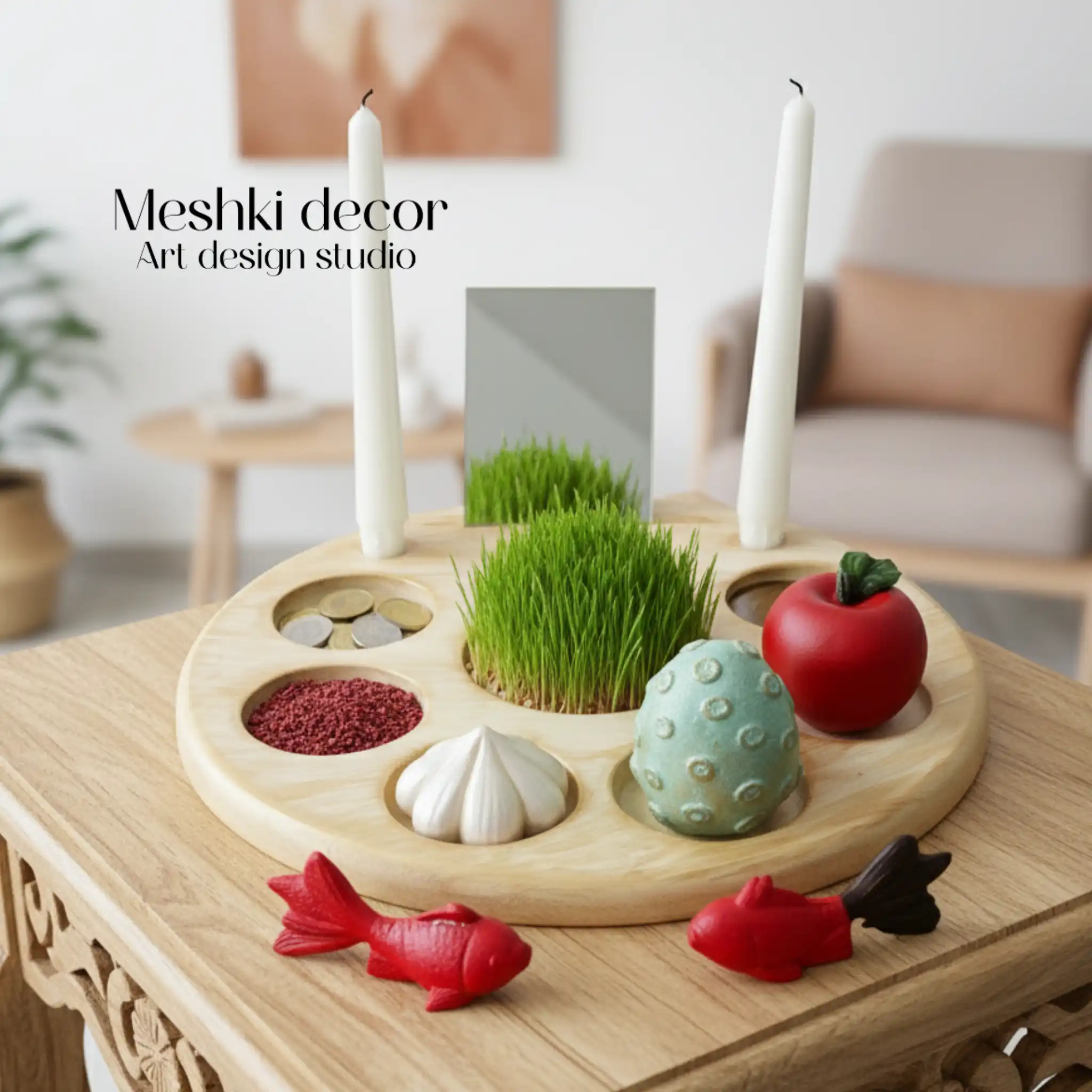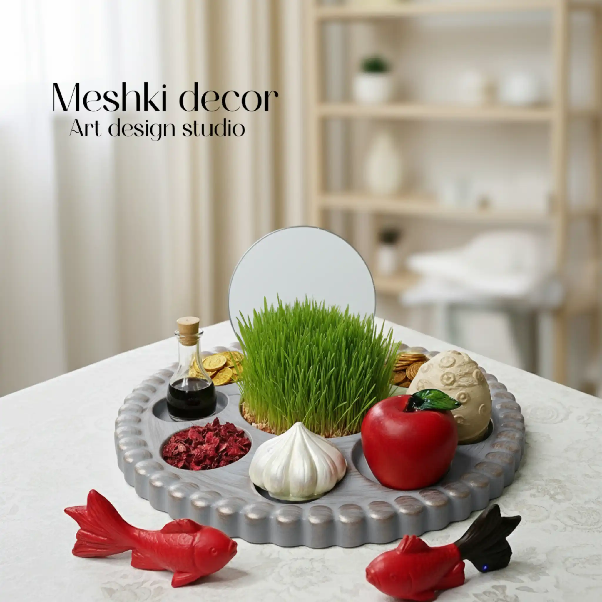 – طراحی مینیمال یکجا: هفت‌سین گرد با قطر ۳۳ سانتی‌متر از جنس سنگ مصنوعی